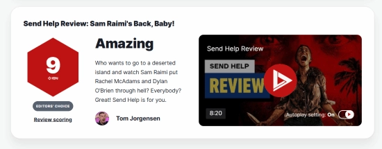 《蜘蛛侠》系列导演山姆·雷米执导的惊悚恐怖片《请求救援》(Send Help)的媒体评价现已正式解禁,知名媒体IGN为其打出了9分的高分评价。