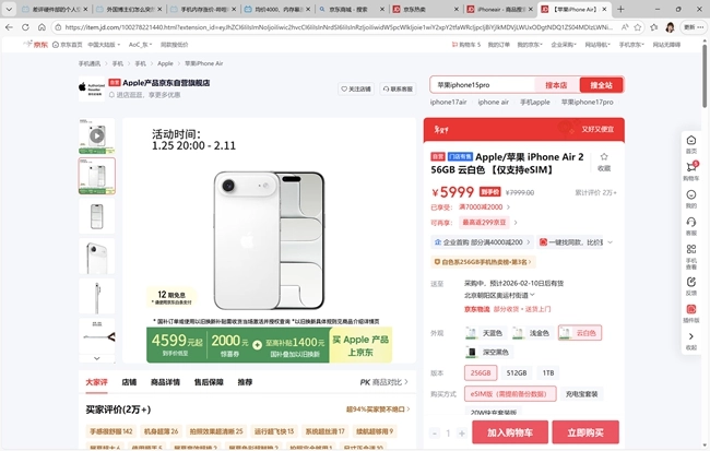 【iMobile爱科技资讯】1月26日,苹果于天猫官方旗舰店和京东自营店启动新年促销活动,256GB版本的iPhone Air直降2000元,叠加国家补贴后,最终到手价低至5499元。该价格相比7999元的首发价便宜了2500元,降幅超过30%。如此罕见的降价幅度,使得这款此前销量未达预期的机型迅速变身“真香机”。