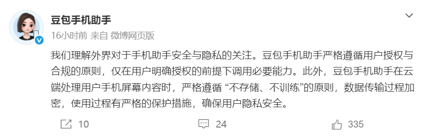 而面对马化腾的公开质疑,字节的反应迅速,当晚官方@豆包手机助手就通过微博进行隔空回应。