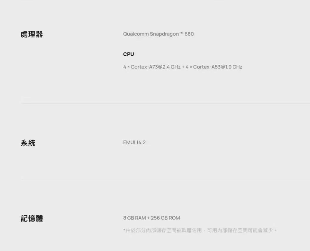 这款机型在系统层面预装了EMUI 14.2操作系统,新加入了表情符号主题、万能卡片等个性化功能,隐私中心还提供应用权限管理、敏感信息脱敏等数据保护手段。需要留意的是,该机型仅支持4G网络,在5G普及率较高的香港市场,这是一种差异化的定位策略,目标用户主要是对网络速度要求不高的备用机使用者或是银发人群。