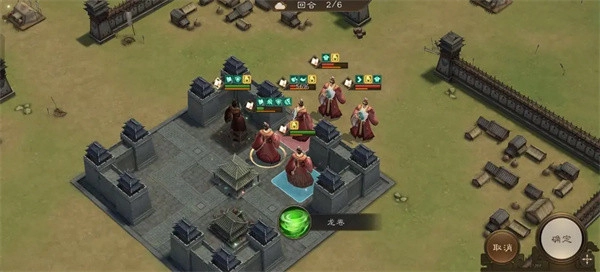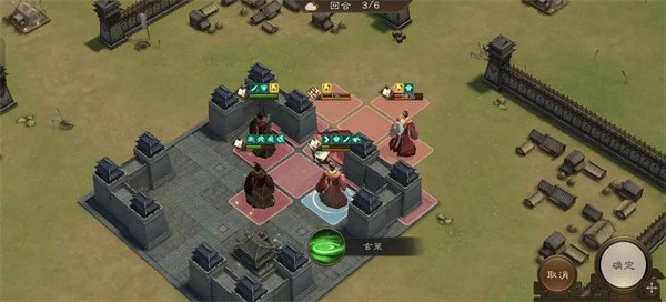 4、第二回合我方操作如下:中间的隐士前进至左上角位置释放技能攻击敌人;右下方的隐士移动到下图所示位置,开启技能对敌人发起攻击;正前方的隐士则后退到中间军营处,在攻击敌人的同时借助军营为自身补充血量。