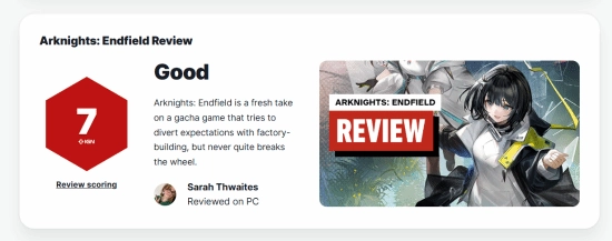 IGN发布了针对《明日方舟:终末地》的媒体评测文章,并给出了7分的评价。
