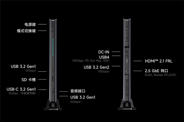 接口配置十分全面:配备一个USB4 Type-C接口、一个USB 3.2 Gen2 Type-A接口、一个USB 3.2 Gen1 Type-C接口、两个USB 3.2 Gen1 Type-A接口、一个HDMI 2.1接口、2.5G网口、SD卡插槽以及音频插孔,此外还设有独立的电源键和模式切换按钮。