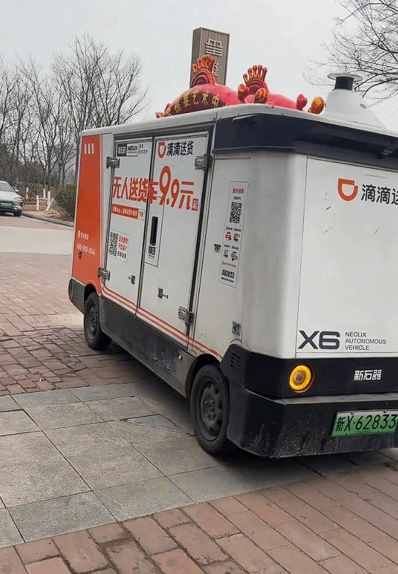 从视频中能够看到,这辆无人送货车隶属于滴滴,其型号是新石器X6,定位为L4级自动驾驶中型物流配送车,是专门为中短途批量配送而设计的。