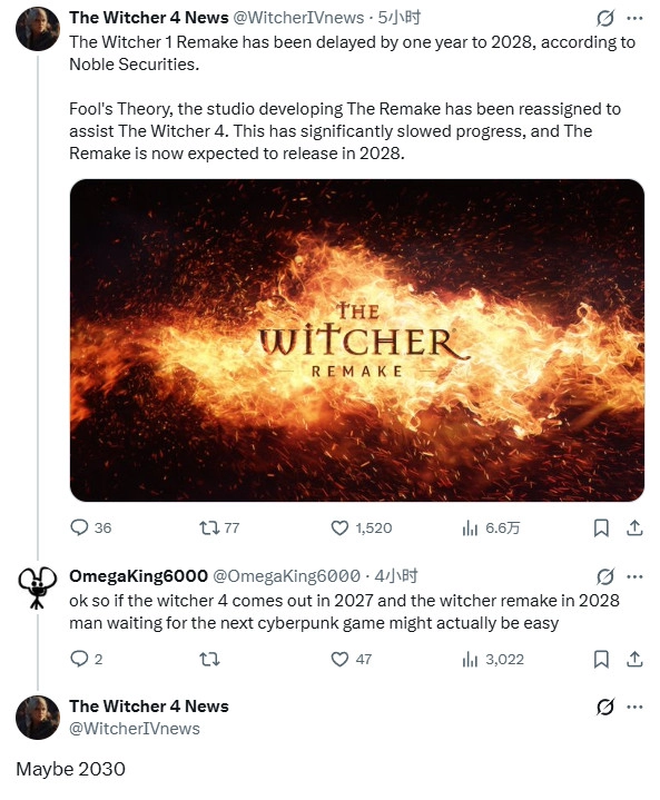 这表明《巫师4》有可能在2027年年底推出,2028年则会迎来《巫师1:重制版》,到了2030年《赛博朋克2》也将与大家见面。