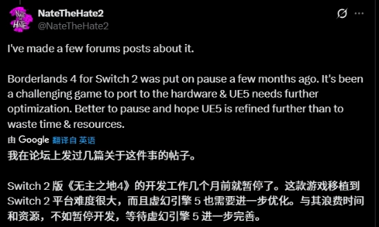 不过,NateTheHate2公开驳斥了这一说法,他称:“这和我了解到的情况不一样,我对这种说法持怀疑态度。”他还补充说明,《无主之地4》Switch 2版本的开发在数月前就已中止,核心问题在于向该硬件移植的难度较大,虚幻5引擎还需要再做优化。在他看来,与其耗费时间与资源,倒不如先暂停开发,等UE5更加成熟后再说。