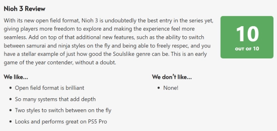 今日,《仁王3》的媒体评分正式公布。国外媒体gamespew为这款游戏给出了满分10分的评价,不仅称它是年度游戏的强劲候选者,还认为这是该系列到目前为止最为出色的一部作品。