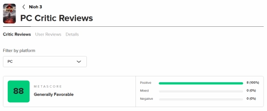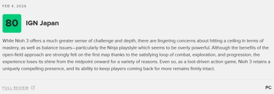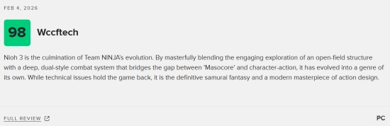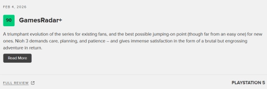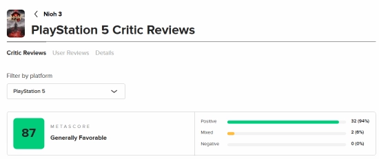 今日,《仁王3》的媒体评分已正式解禁。截至目前,据M站数据显示,该游戏PS5版本的媒体均分达87分,参与评分的媒体共计34家,其中给出好评的有32家,中评2家,尚未出现差评;而PC版本的媒体均分则为88分,参与评分的8家媒体均给出了好评。