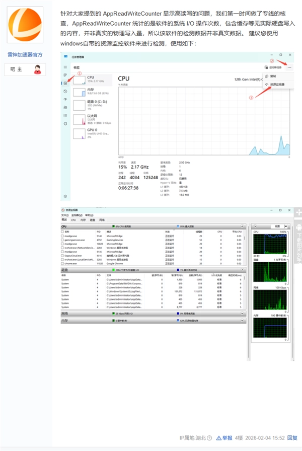 该吧吧主“雷神加速器官方”进一步解释道,针对大家反映的AppReadWriteCounter显示高读写量的问题,我们第一时间通过专线进行了核查。