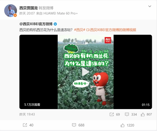 西贝创始人贾国龙的账号解禁后,第一件事就是转发科普视频来解释“速冻有机西兰花”,你对此有什么看法?欢迎在评论区参与讨论!