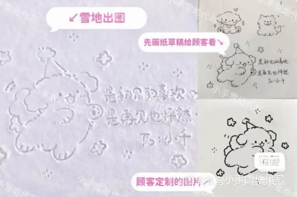 这项看似简单的业务对代写者有一定要求:不仅字要工整美观,最好还具备一定美术功底,能应要求绘制图案或堆砌小雪人。一位在二手平台接单的商家会先根据客户需求设计草图,再实现在雪地上。订单均价几十元,旺季时她从早忙到晚,在生意最好的月份,仅凭此副业月入可达万元。