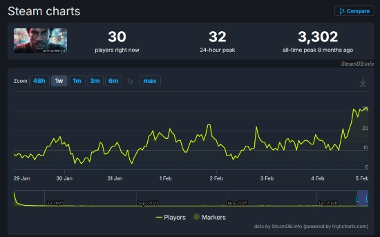 尽管这款游戏最近在Steam平台上的评价略有回暖,但实际处境依旧十分严峻:根据SteamDB的数据,过去一天里它的玩家峰值人数仅为31人。在Discord社区中,许多老玩家对游戏更新的实际价值提出了质疑,同时也对开发工作室长期以来的缄默态度感到颇为不满。