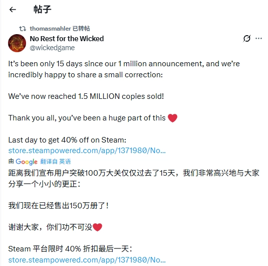 官方在推文中提到:“距离我们宣布销量突破100万份仅过去15天,现在我们很高兴地带来一个小小的‘更新’:目前销量已正式达到150万份!”