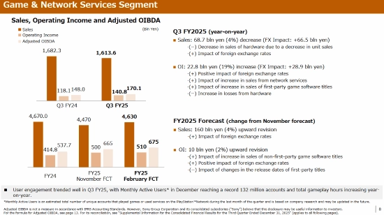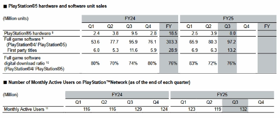 索尼今日发布了2025财年第三季度的财报,以下内容仅摘录了其中与游戏业务相关的部分: