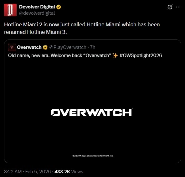 另外,《迈阿密热线》的发行商曾以戏谑的方式调侃暴雪的《守望先锋》——后者将包含大型DLC的《守望先锋2》更名为《守望先锋》,此举意在挽救该游戏持续下滑的人气。