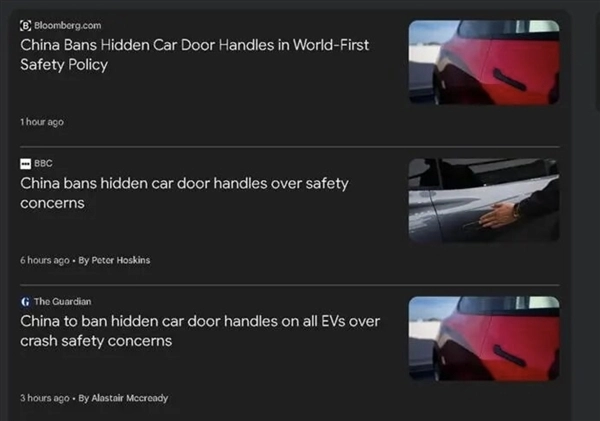这意味电动车使用的隐藏式门把手被禁,中国成为全球首个逐步淘汰这种设计的国家。