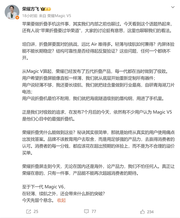 2月5日消息,昨晚,荣耀终端产品线总裁方飞通过微博,就“苹果计划推出折叠手机”这一话题发表了相关看法。