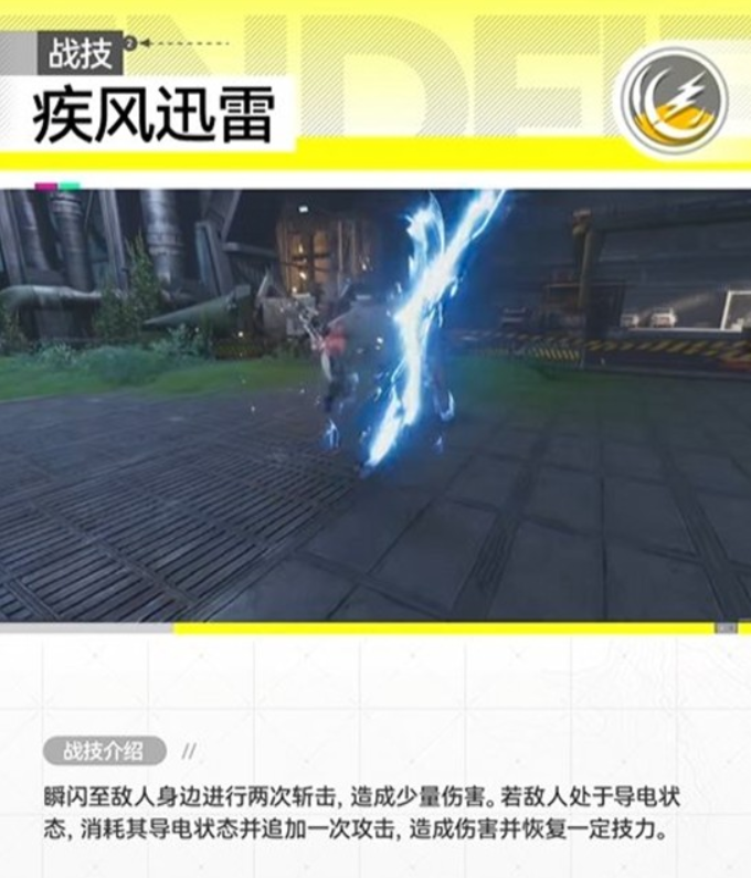 身形骤闪至敌人近前,挥刀施展两次斩击,对目标造成少量伤害。若敌人身上带有导电效果,则会清除该状态,并额外发动一次攻击,在造成伤害的同时,为自身恢复一定技力值。