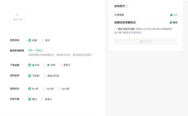 目前,该功能的推广目标可设置为“提升阅读量”或“增加新关注”。推广所需费用需使用“微信豆”支付,购买比例为1元对应10个微信豆。