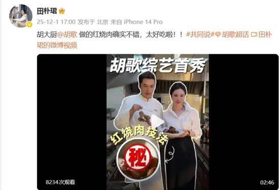 1日下午,节目主持人田朴珺发布了一段胡歌烹制红烧肉的视频,并配文称:“胡大厨胡歌做的红烧肉确实很赞,味道太棒了!!”