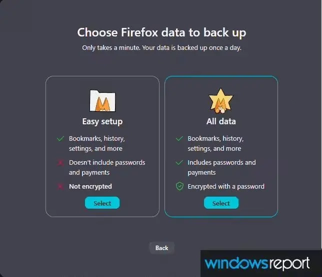 针对选择“备份至 PC”的用户,Firefox 额外提供了两种数据处理模式: