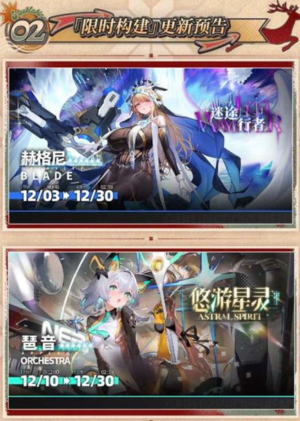限时构建「迷途行者」与「悠游星灵」活动即将开启,灭刃阵营六星干员“赫格尼”、乐团阵营六星干员“琶音”将在本次构建中登场,且通过该构建获取这两位干员的概率将得到提升!