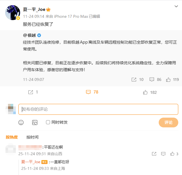 12月2日,小雷最近频繁在微博刷到关于极越的内容,极越官方微博发布通知称,此前许多车主反馈App显示离线、远程控制功能无法使用,技术团队连夜进行抢修,目前所有功能均已恢复正常。随后,CEO夏一平转发了这条微博,有网友在评论区留言询问“平哥还在啊?”,他回复了五个字:“一直都在啊”。