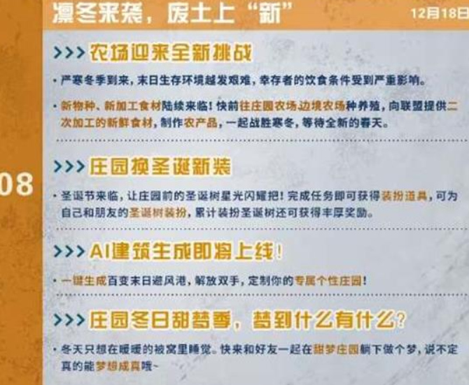 12月18日,寒冬已至,末日生存的艰难程度不断加剧,幸存者的饮食状况面临严峻挑战。全新的物种与加工食材正陆续出现!幸存者们可前往庄园农场及边境农场开展种养殖活动,为联盟提供经过二次加工的新食材,并制作各类农产品,携手共渡寒冬,期待崭新春天的到来。