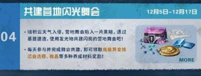 暗积云席卷而来,营地舞会顿时被黑暗笼罩。现在,让我们通过基建搭建,用荧光材料共同打造一场璀璨的营地舞会吧!每日参与并完成舞会的共建任务,就能领取高级异变核芯自选箱、微晶等丰富养成材料奖励!