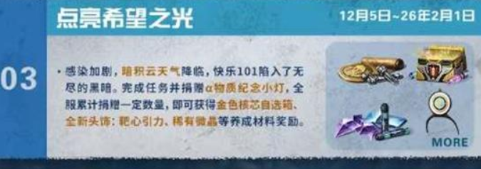 感染愈发严重,暗积云笼罩天空,快乐101被无尽的黑暗吞噬。完成指定任务并捐赠α物质纪念小灯,当全服累计捐赠达到相应数量时,就能领取金色核芯自选箱、全新头饰“靶心引力”以及稀有微晶等养成材料奖励。