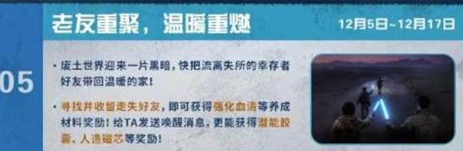 废土世界陷入一片黑暗,快把那些流离失所的幸存者好友带回温暖的家吧!只要找到并收留走失的好友,就能获得强化血清这类养成材料奖励;要是给TA发送唤醒消息,还能拿到潜能胶囊、人造磁芯等好礼呢!