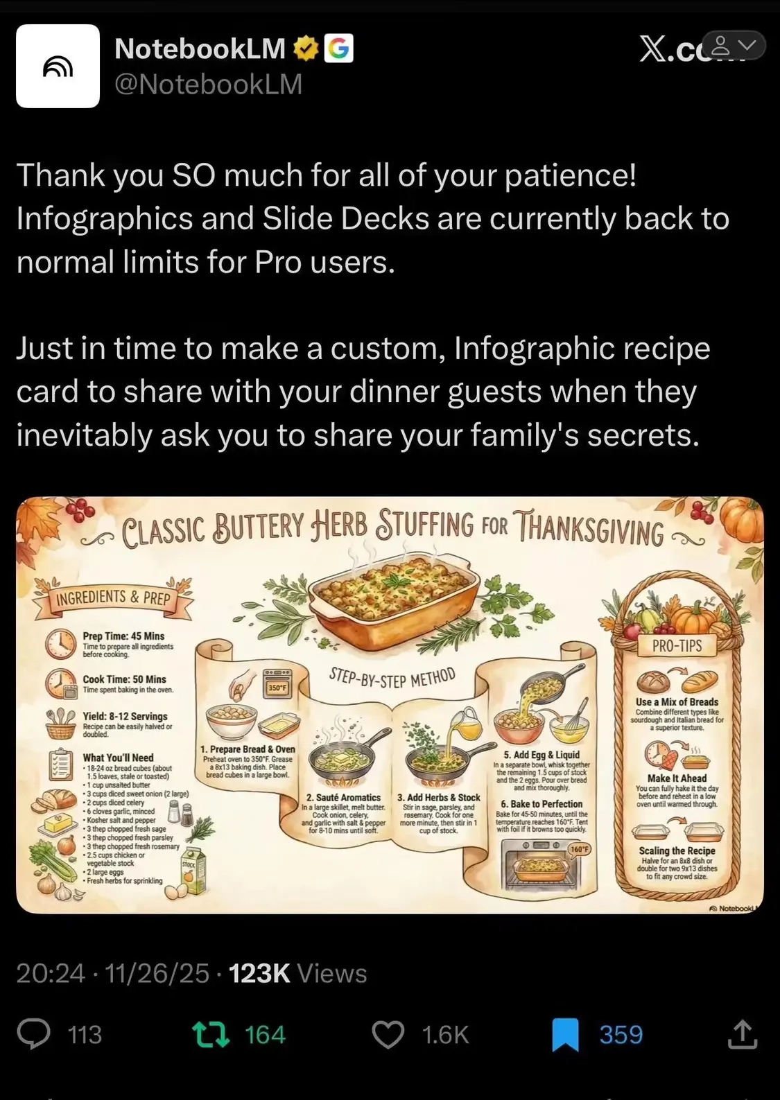 IT之家引用相关博文内容称,事情的起因是该账号发布了一张由AI生成的“经典黄油香草填料(Classic Buttery Herb Stuffing)”食谱信息图,其目的在于推广自身最新的图像模型Nano Banana Pro以及NotebookLM的图表制作功能。