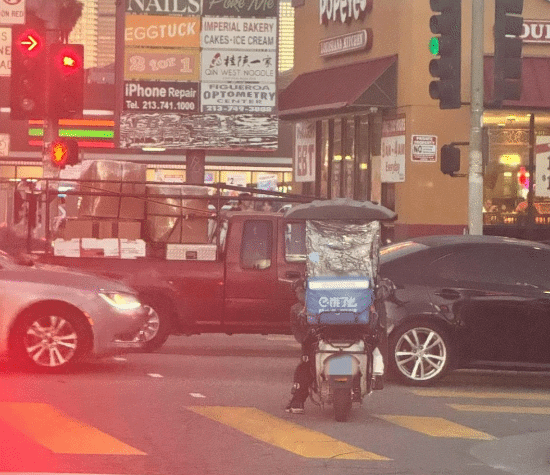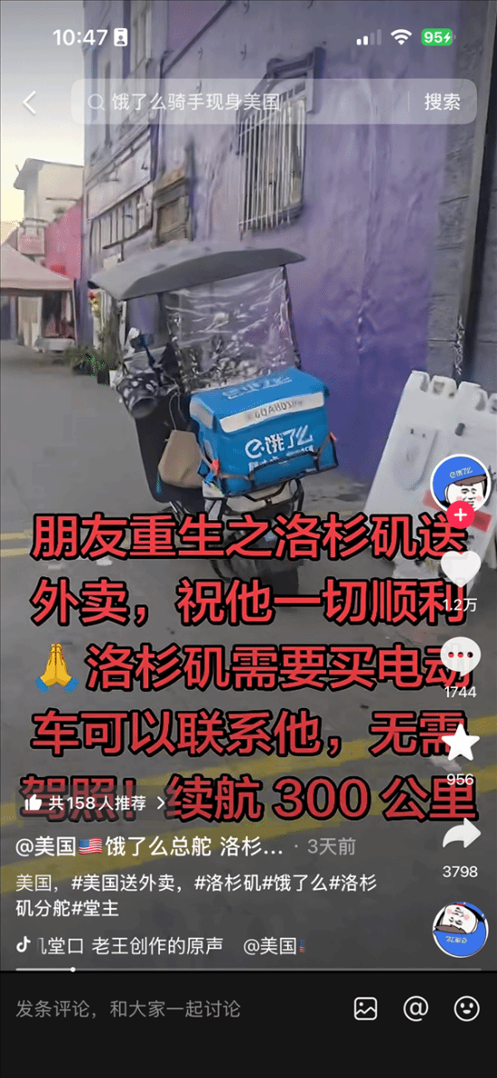 这位骑手之前在国内的饿了么平台做外卖配送,后来因为一些原因,他把自己的装备,像电动车和饿了么外卖箱,通过海运寄到了洛杉矶。
