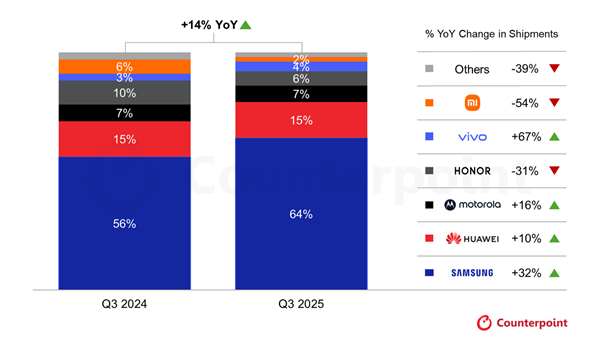 整体而言,大折叠形态是市场增长的关键驱动因素,三星Galaxy Z Fold7的发布与华为Mate系列的持续深耕,合力助推该品类份额攀升。