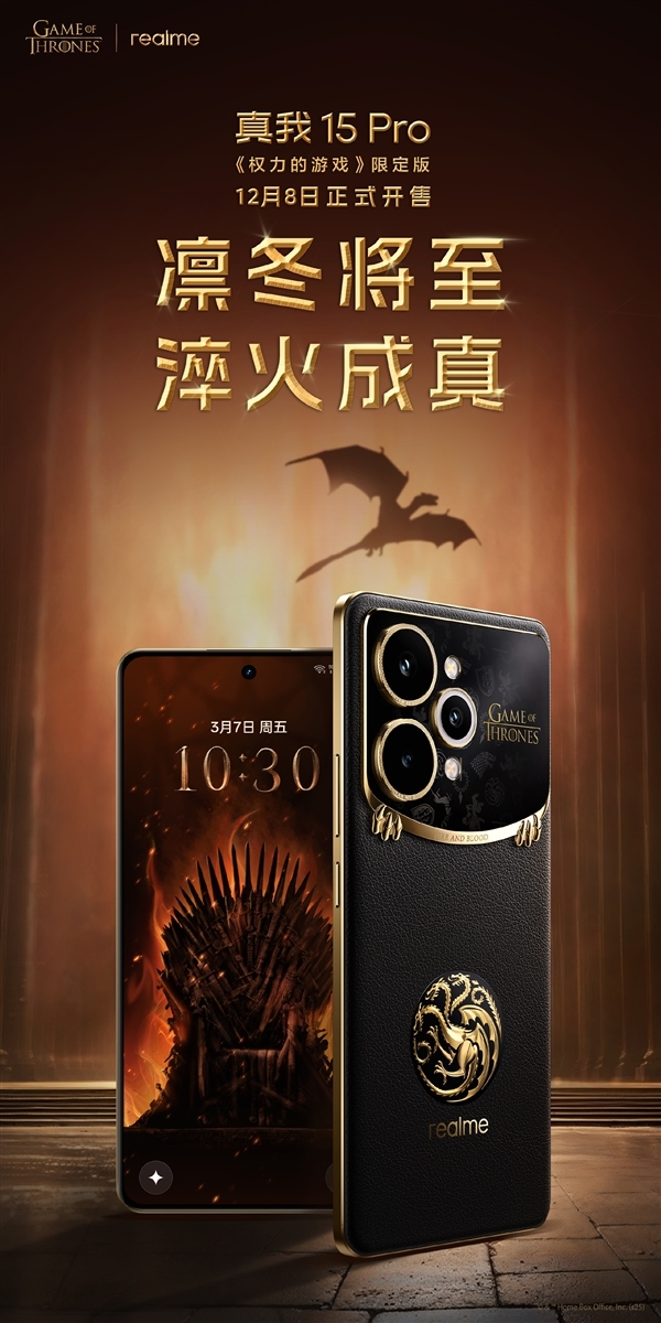 12月3日消息,真我15 Pro《权力的游戏》限定版国行今日正式官宣,定于12月8日正式发售。