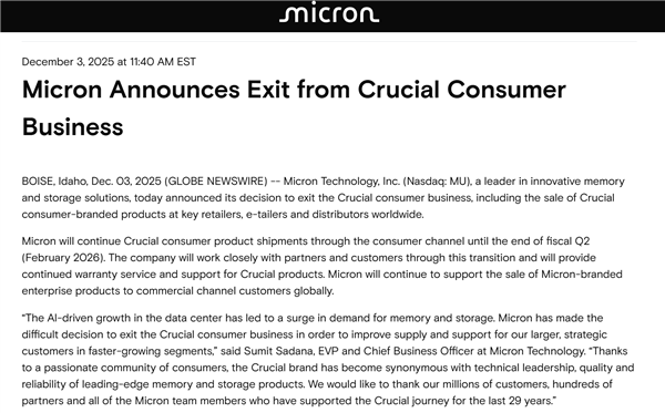 对于这一决定,美光执行副总裁兼首席商务官Sumit Sadana称:“AI驱动的数据中心增长,催生了对内存和存储的旺盛需求。美光已作出艰难抉择,退出Crucial消费级业务,旨在更优地为增长更迅猛板块中的大型战略客户提供供应与支持。”
