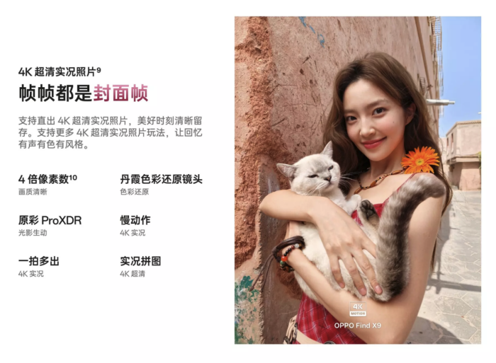 在影像表现这块,OPPO Find X9 系列不只是硬件上做了全方位提升,在影像的创意玩法和最终成片的体验上,也保持着旗舰机型该有的专业水平。整个系列都支持 4K 实况照片功能,按下快门的那一刻就能捕捉到更充足的动态细节,而且每一个画面都能成为清晰定格的封面帧,让拍出来的内容既有照片的高清晰度,又带着视频那样的鲜活感。