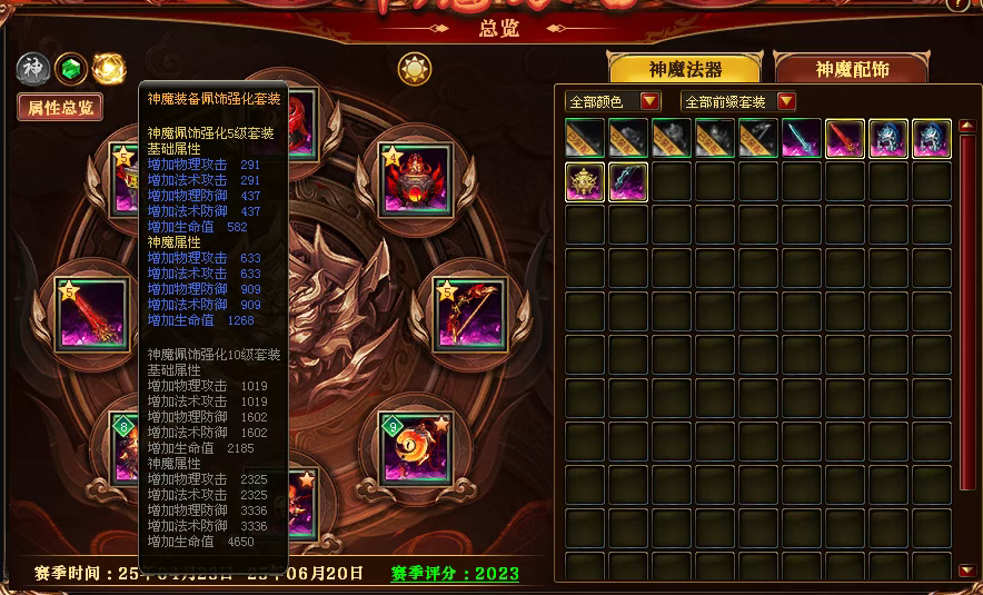 神魔装备涵盖基础属性与神魔属性两部分,其中神魔属性、装备自带的词条属性以及神魔套装的前缀属性,仅在特定的神魔战场内发挥作用;至于基础属性,则是在神魔战场之外的其他场景中生效。