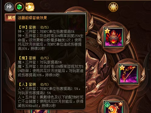 法器套装前缀分为【神】、【魔】、【人】三种,达成3件套、5件套都会有不同的套装效果。