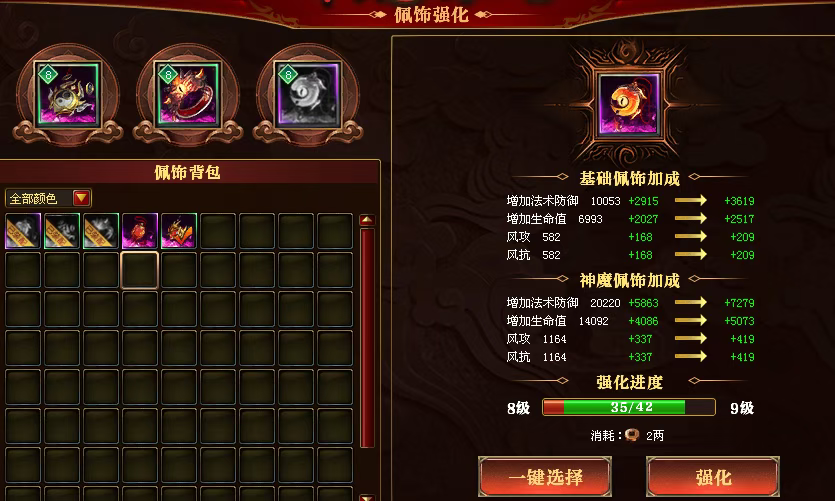 神魔装备总共有8个装备位,分为神魔法器5件(剑、鼎、冠、炉、弓)、神魔佩饰3件(戒指、项链、玉佩)。