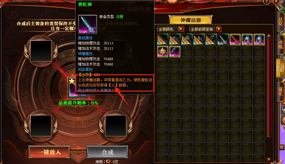 神魔装备的品质以四种颜色区分,按品质从低到高依次是黄、绿、紫、橙。在这些装备里,法器不仅能通过日常途径获取不同颜色品质的,还能借助合成来提高其颜色品质等级;而配饰则不支持合成操作。