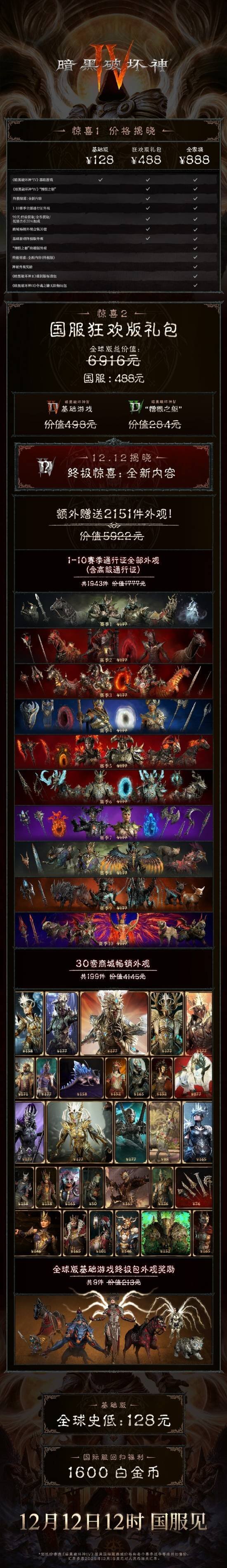 今日,《暗黑破坏神》国服官方账号正式公布了《暗黑破坏神4》国服回归的三档礼包定价及内容详情,以此为12月12日国服全面上线进行预热。此次共推出基础版、狂欢版与全家桶三大版本,旨在满足不同玩家的多样化需求。
