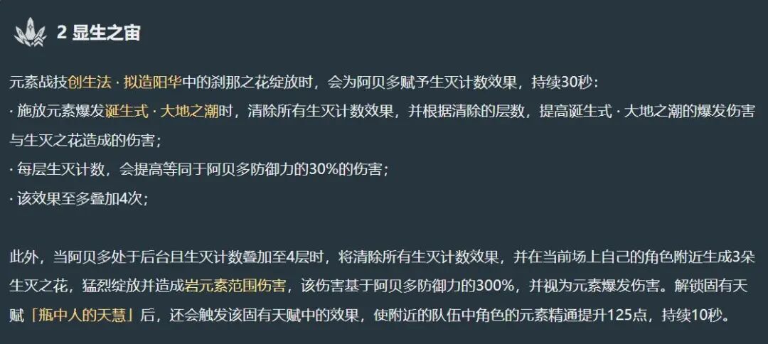 新版本:元素战技命中敌人时会生成瑰银,瑰银能进一步增加该战技造成的伤害,其提升数值等同于阿贝多防御力的240%。