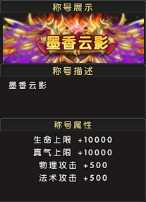 称号属性:生命增加10000点,真气增加10000点,物理攻击提升500点,法术攻击提升500点;
