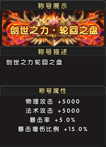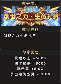 称号属性:物理攻击增加5000点,法术攻击增加5000点,暴击率提升5.0%,暴击增伤比例提高15.0%