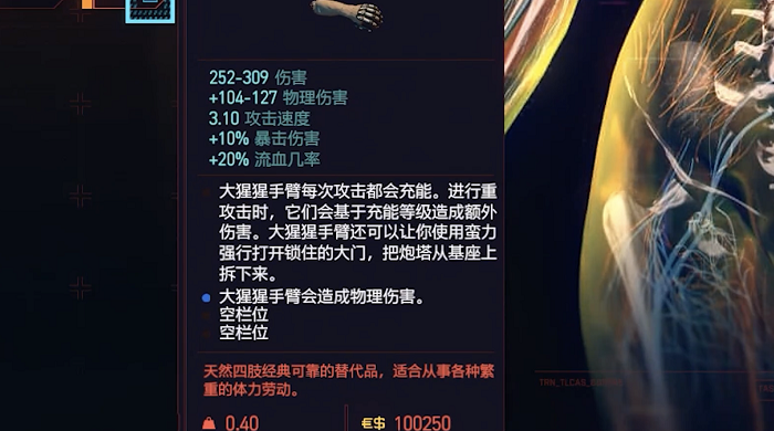 不难发现,黑市电池带来的100%额外蓄力伤害效果相当强力,不过这个额外伤害加成并非适用于所有义体,仅能搭配大猩猩手臂使用。要是还没有大猩猩手臂,也可以前往义体医生处进行购买。