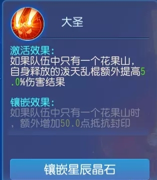 当队伍只有花果山角色时,提升玩家的破天乱棍打的伤害和抵抗封印的属性。