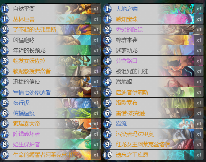 在宇宙任务德的卡组构成上,核心部分由优质的宇宙体系单卡、法术卡以及围绕任务构建的相关随从卡组成,像大地之鳞、凶猛咆哮、了不起的杰弗里斯、蜂群来袭、迷梦幼龙、分岔路口、软泥教授弗洛普、被诅咒的门徒、迅捷的信使、启迪者伊利斯、雷诺等卡牌都在其列。