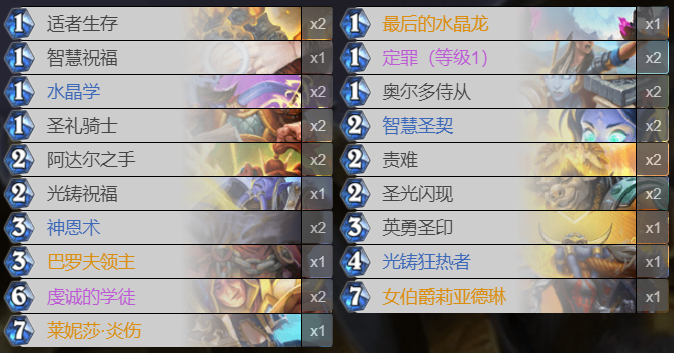 在水晶龙任务骑的卡组构成上,核心框架是圣契体系与任务体系,同时融入了众多buff类法术和圣契卡牌,像适者生存、智慧祝福、智慧圣契、圣光闪现、英勇圣印都在其中,还搭配了圣礼骑士、奥尔多侍从这类优质低费随从。