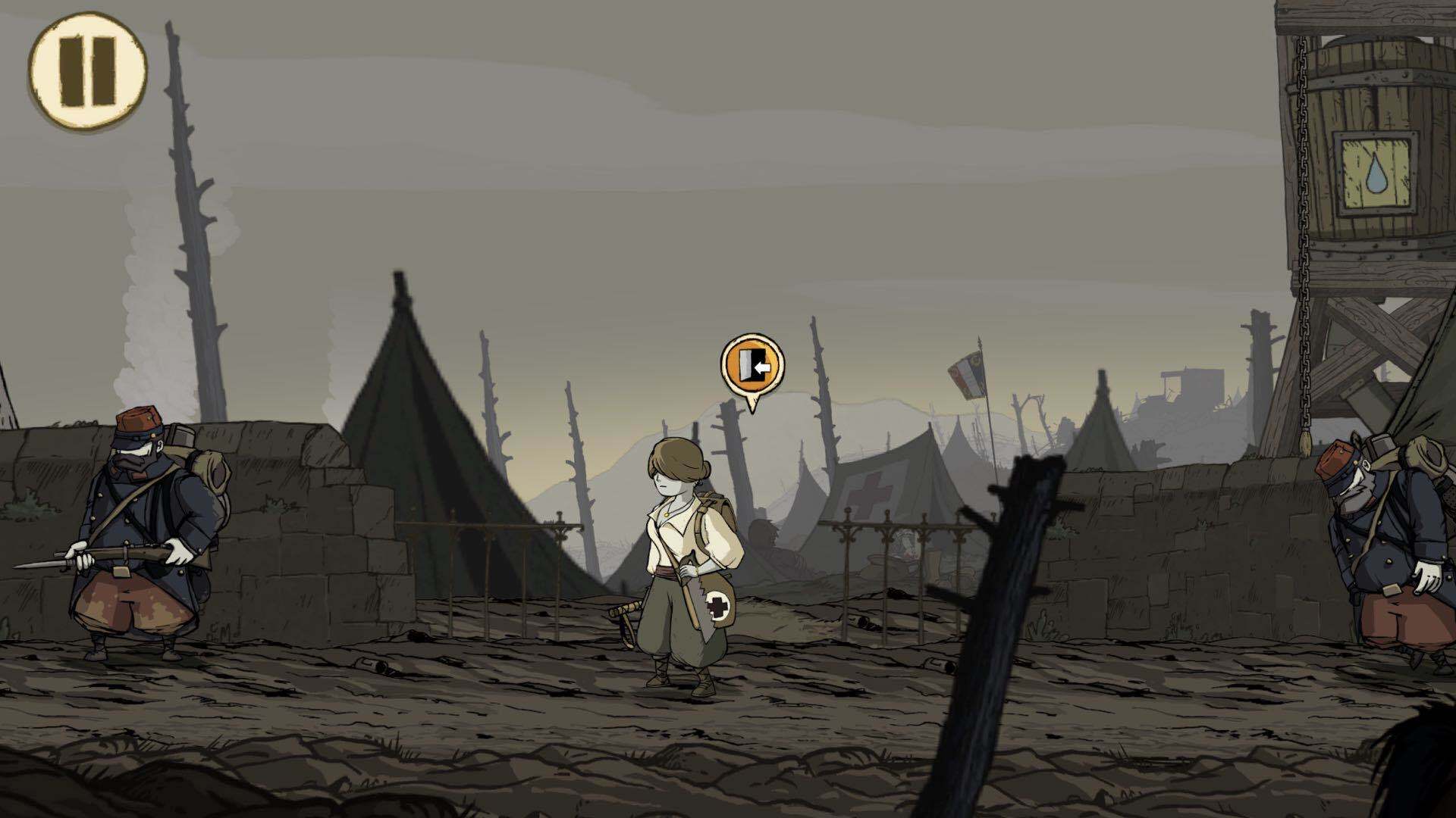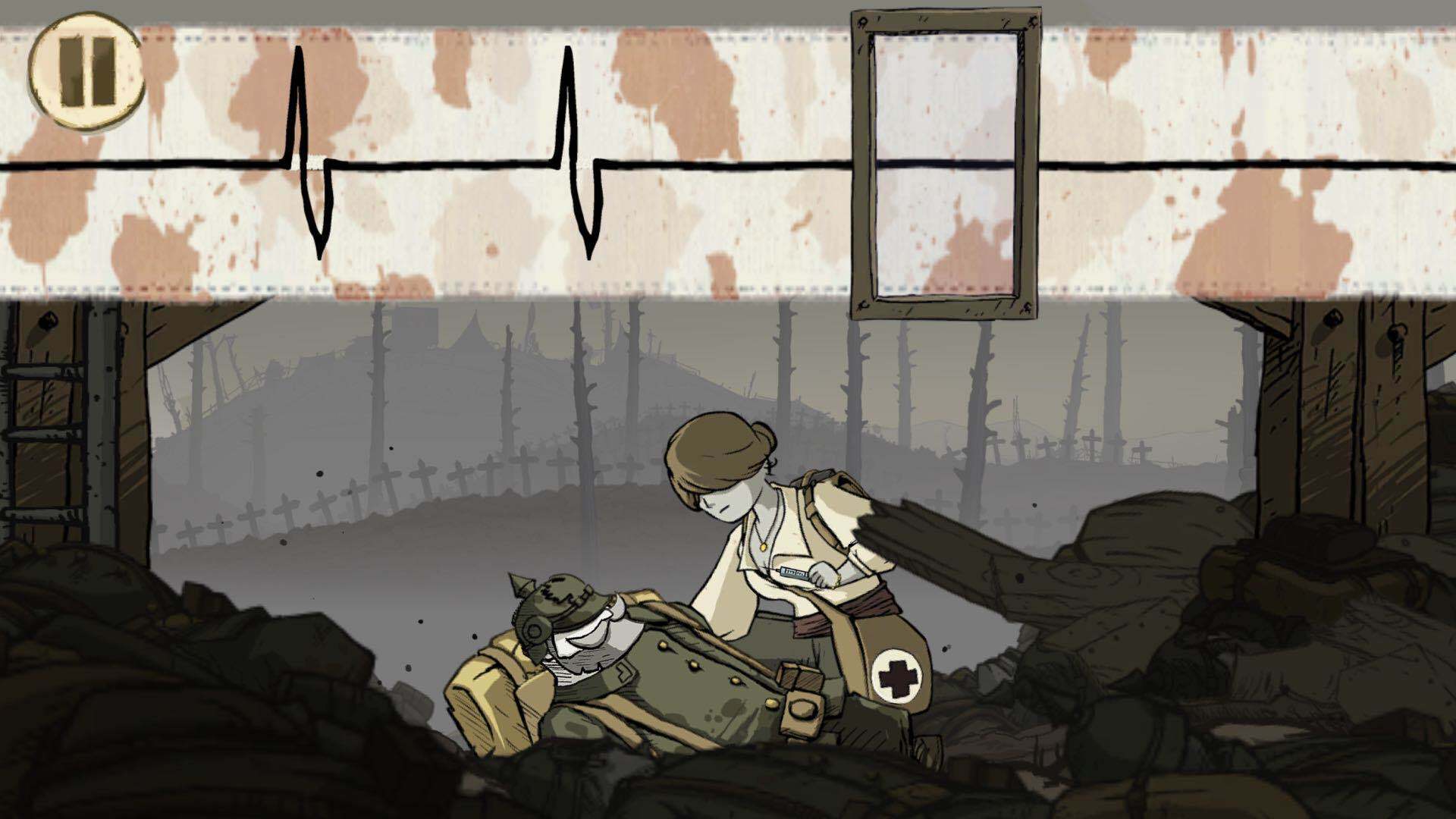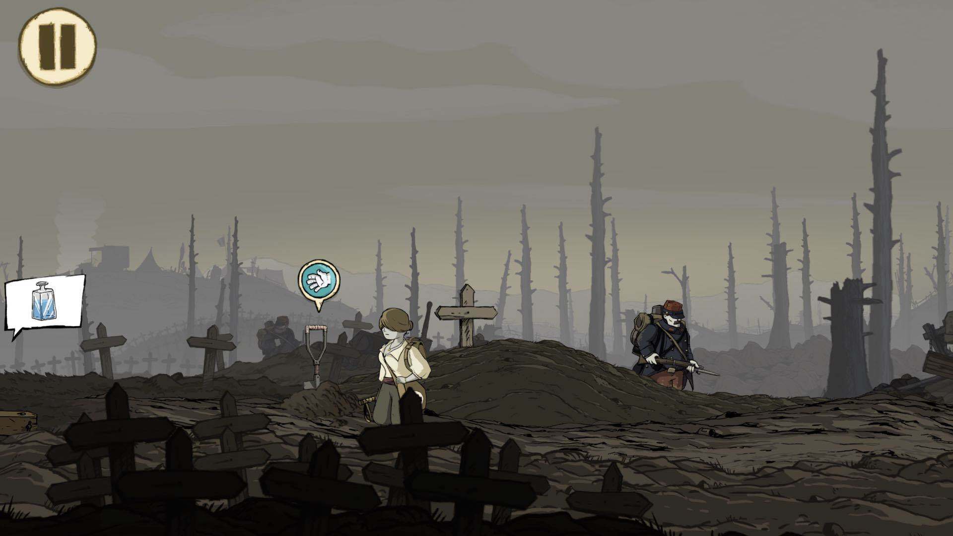拿着围巾一直向右走,会看到一名受伤的士兵急需绷带治疗。把围巾当作绷带为他包扎,就能帮助他止血。之后继续向右奔跑,会看到一个十字架;在此之前,玩家应该注意到有个士兵正在为牺牲的战友挖掘坟墓。将十字架拉过去交给他,坟头便会出现一把铁铲。拿起铁铲往左边跑,会遇到需要拐杖的士兵,把铁铲递给他当作拐杖即可。